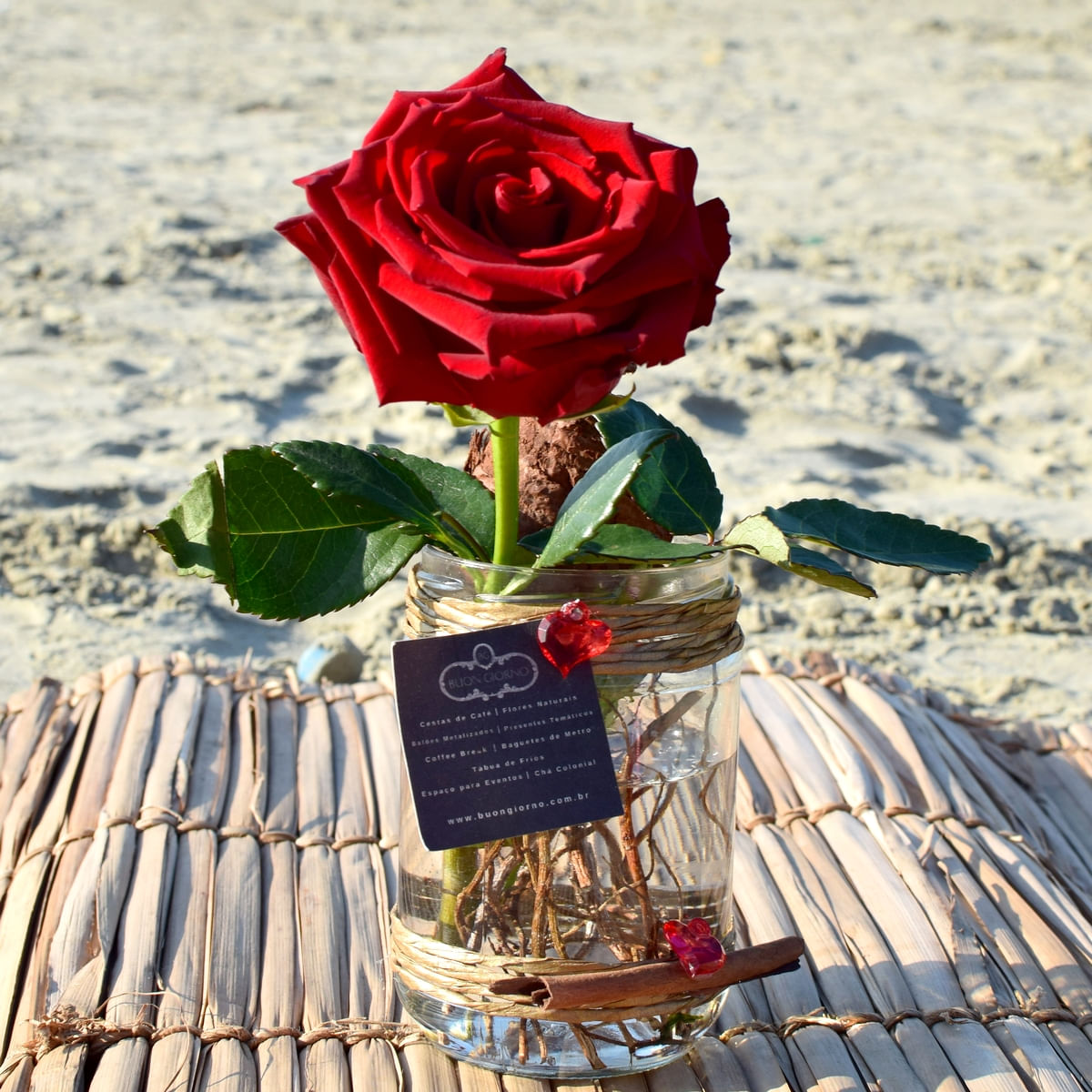 descrição: - 01 Rosa Colombiana Vermelha - 01 Vidro Reciclado - Fio Kraft - Canela - 02 Mini Corações de Acrílico