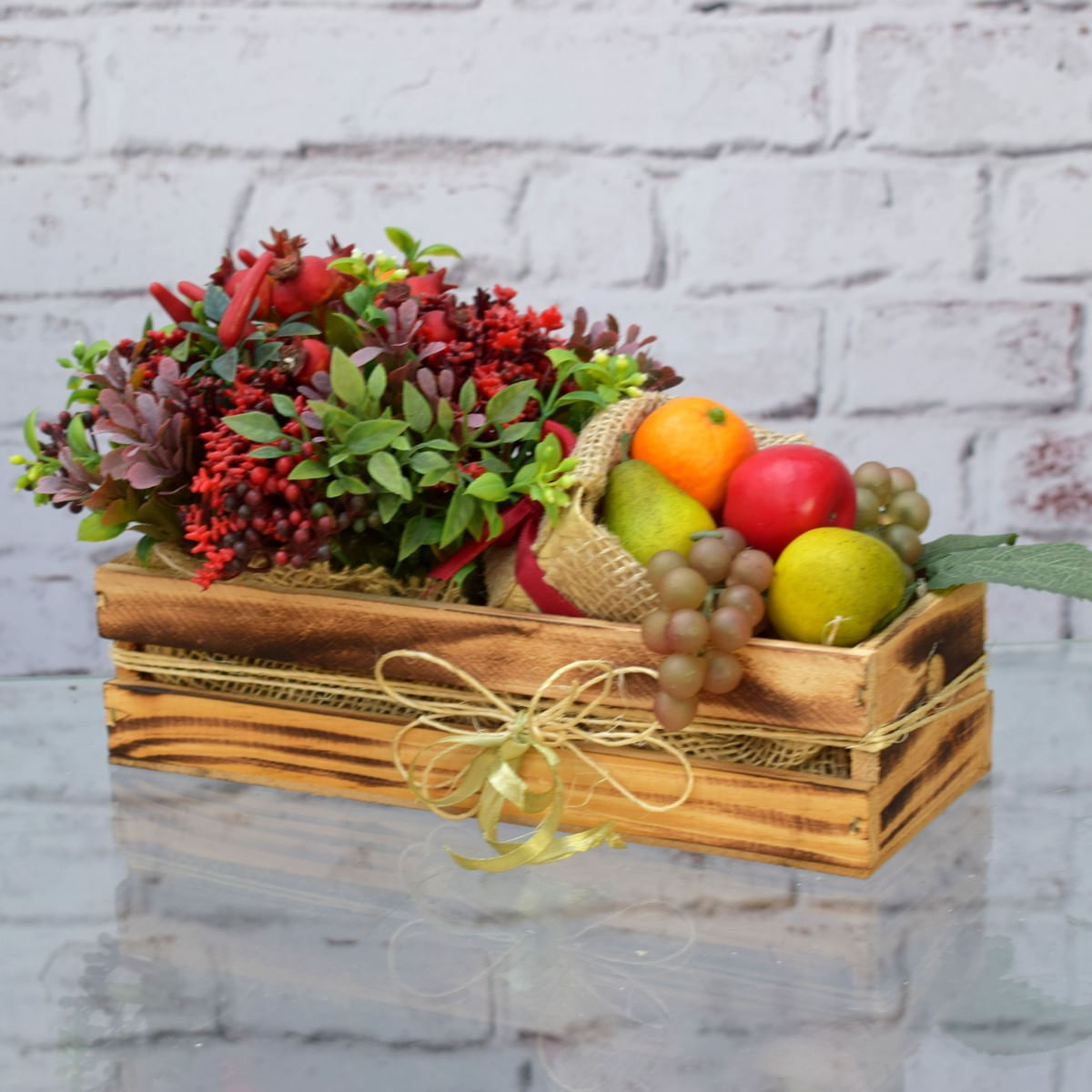- 01 Cestinho em Palha com Frutas Artificiais: Maçã + Laranja + Pera + Uva + Maçã Verde
