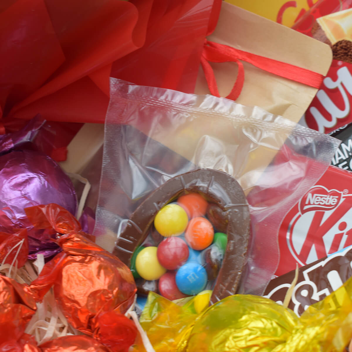 qtd produtos marca peso 1 alfajor borussia 50g 1 barra de Chocolate Diamante Negro lacta 90g 1 barra de Chocolate Suflair nestlé 80g 5 bombom de Chocolate borussia und 1 caixa de Bombom garoto 250g 1 casca de Ovo de Chocolate com Confeito borussia und 1 confeito de Chocolate m&ms 45g 1 kit Kat nestlé 41,5g 1 palito de Chocolate No Saco Kraft P biscoitos Novais 50g 2 trufas borussia 20g decoração laço Cetim de 22 Cm/acrlico/aljofre/celofane/palha/