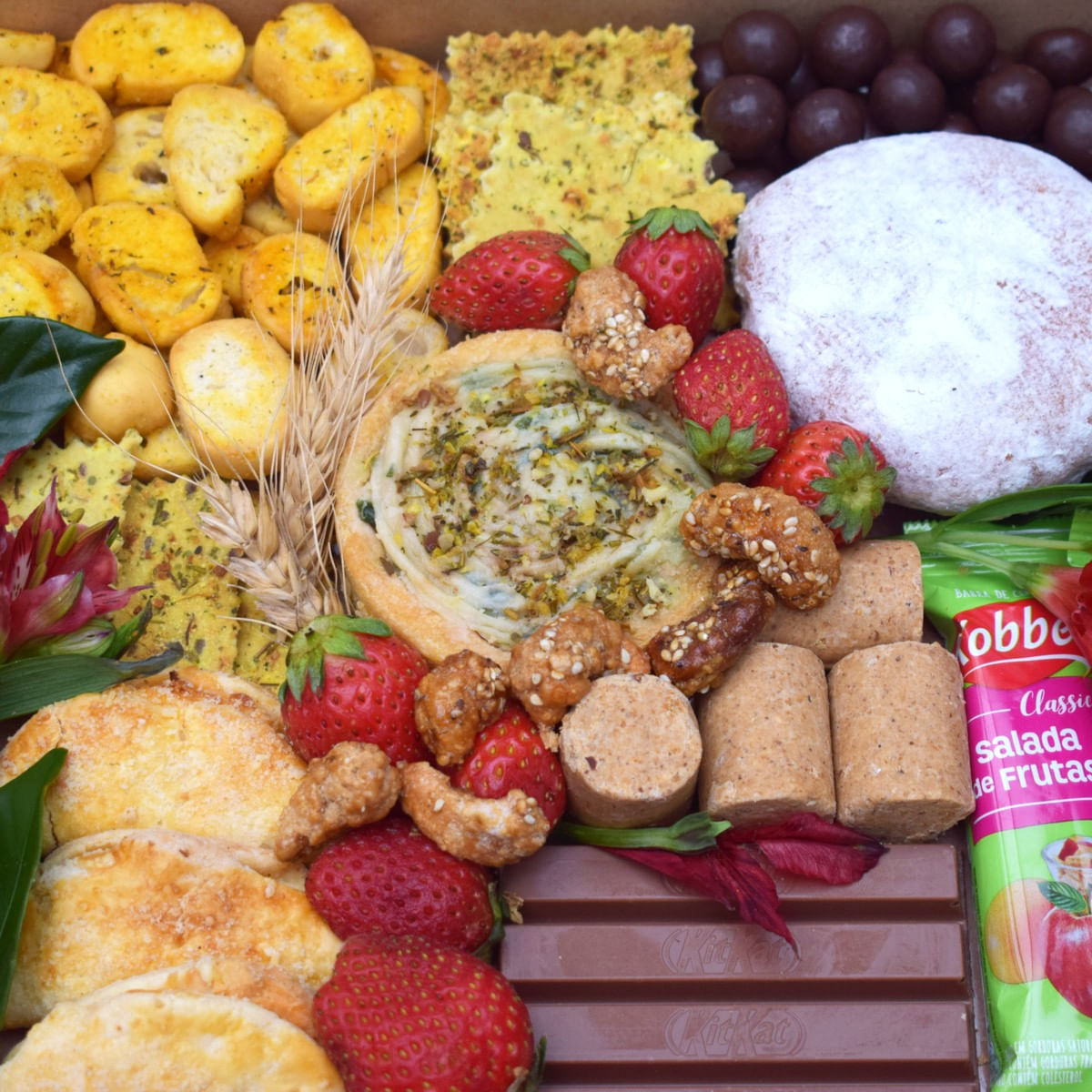 qtd produtos marca peso 2 barra de Cereal kobber 20g 1 biscoito Linhaça Ervas Finas biscoitos Novais 50g 1 bolacha Cerale baudduco 100g 1 caju Caramelizado amendoas do Ceará 20g 1 confeito Waffer de Chocolate/dragee borussia 50g 1 doce de Amendoim doces Confirma und 1 kit Kat nestlé 41,5g 6 mini Salgado buon Giorno und 4 paçoca dacolonia und 1 quiche due Fratelli/denise und 1 torradinha de Alho biscoitos Novais 70g 1 donut melhor Bocado 70g 8 morango fruta und decoração laço Cetim de 22 Cm/acrlico/aljofre/tnt/flores/flores Secas ou Trigo