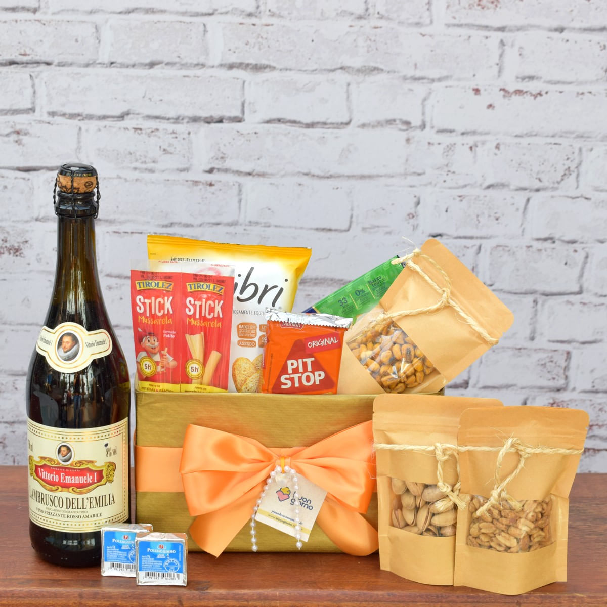 qtd produtos marca peso 1 amendoim No Saquinho amendoas do Ceara 115g 1 biscoito Pitstop marilan 27g 1 eqlibri elma Chips 40g 1 milho Mostarda e Mel amendoas do Ceara 50g 1 pistache No Saquinho amendoas do Ceara 70g 2 polenguinho polenghi 22g 1 torrada adria 142g 1 vinho lambrusco 750ml (de Acordo com Estoque) 2 stick de Mussarela tirolez 60g decoração laço Cetim de 22 Cm/acrlico/aljofre/palha