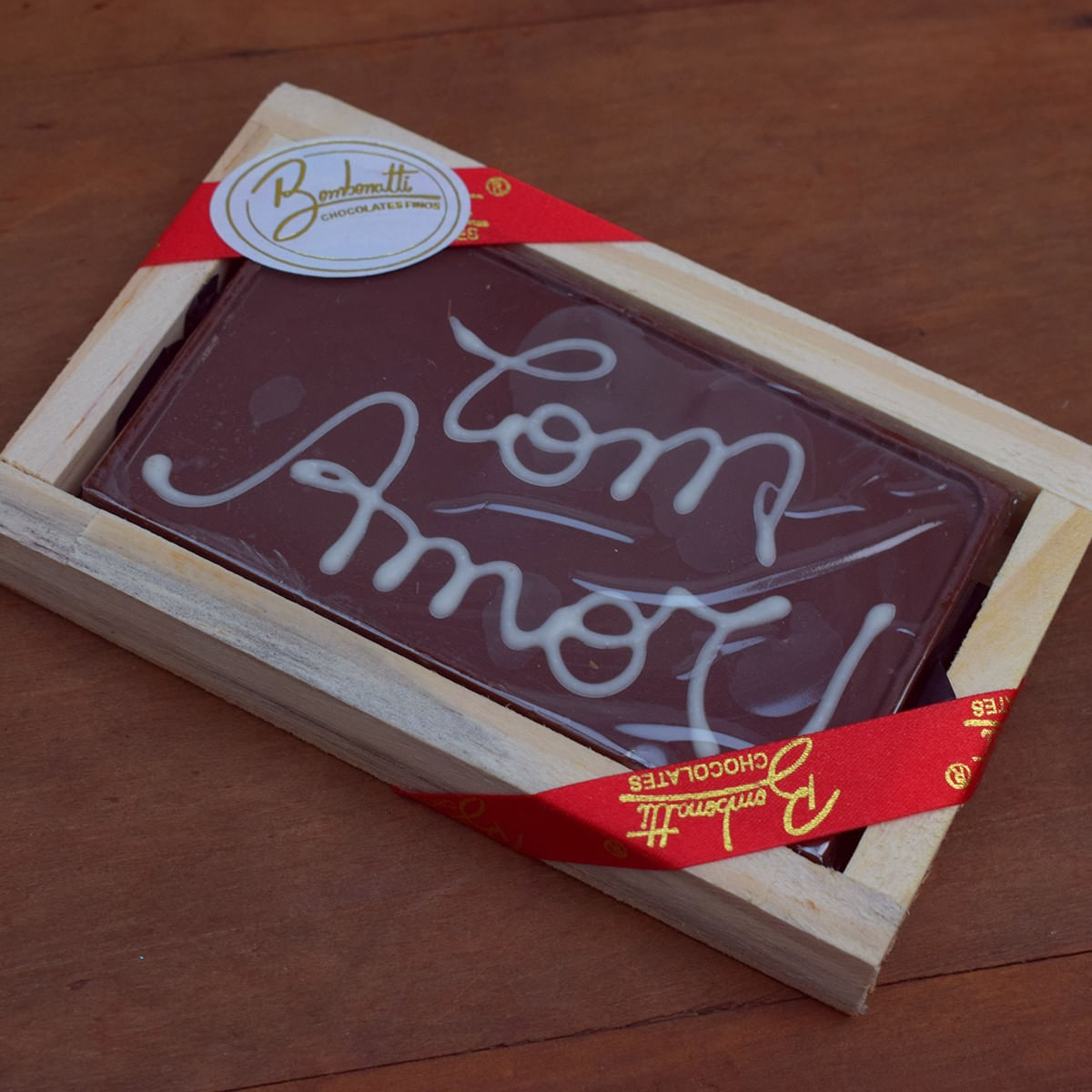 Barra de Chocolates Bombonatti Ao Leite com Dizeres "com Amor". com Detalhe Ao Redor de Madeira