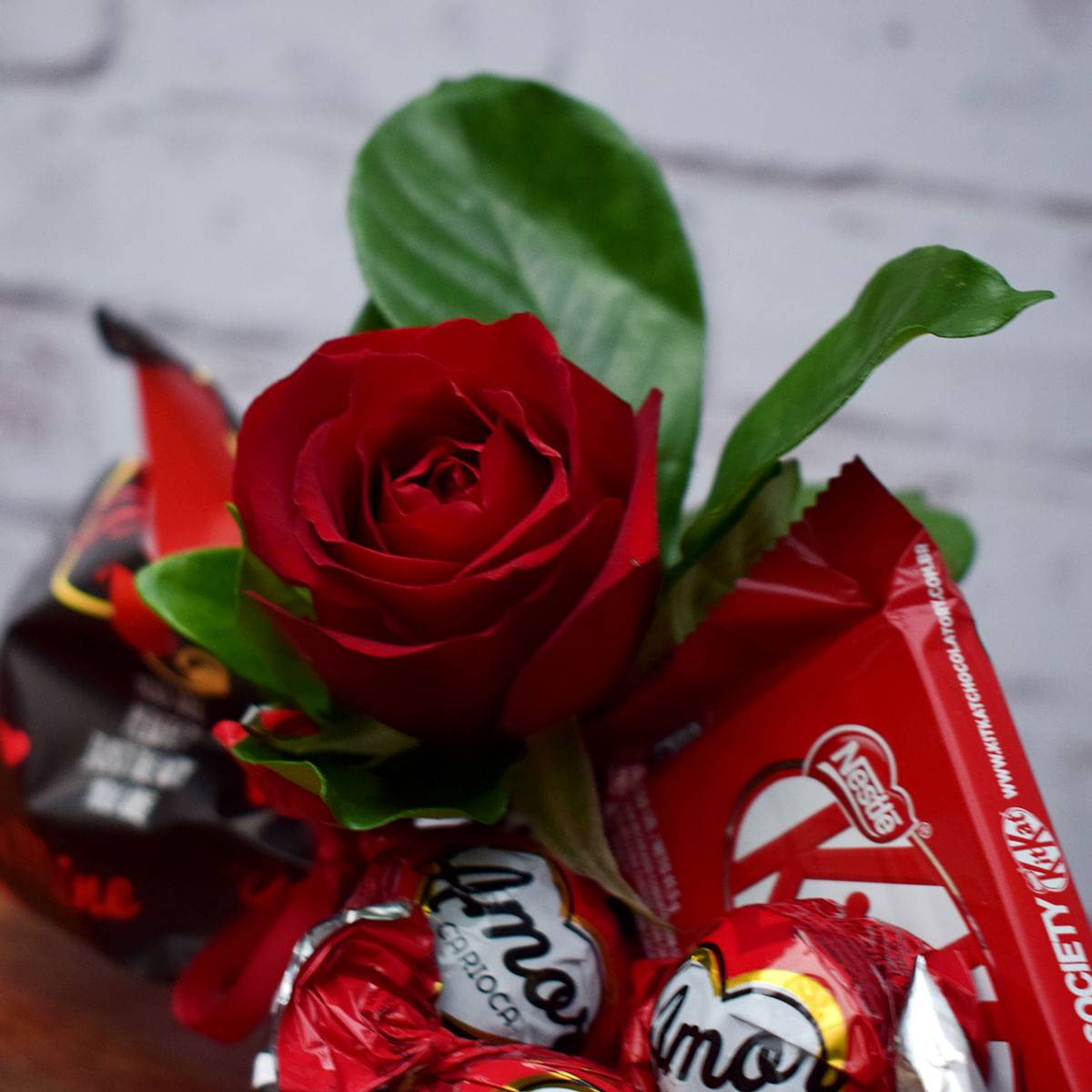 descrição: - 01 Canoa de Chocolate Belga 110g - 01 Kit Kat - 04 Bombom Amor - 01 Rosa Carola Avulsa Simples - Decoracao em Celofane Temático Love e Laço Acetinado