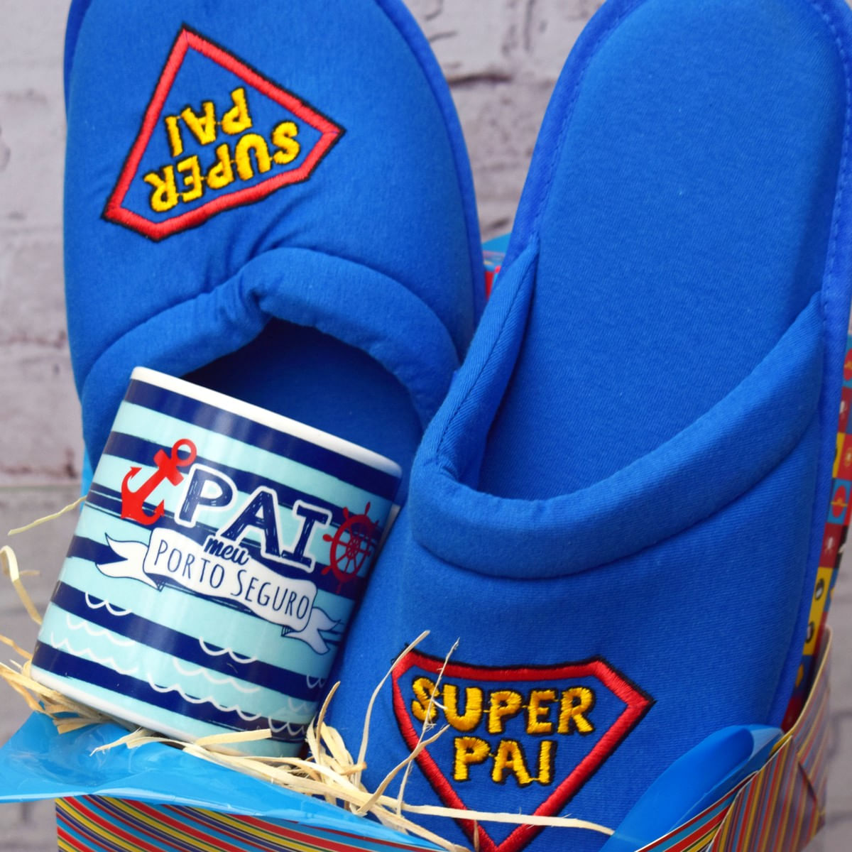 qtde produto marca 1 pantufa Super Pai Comics Azul happy Days (escolher o Tamanho) 1 caneca Pai Porto Seguro 1 caixa de Presente Kingdom 1 balão Bubble G escrito "pai Te Amo" 1 decoração