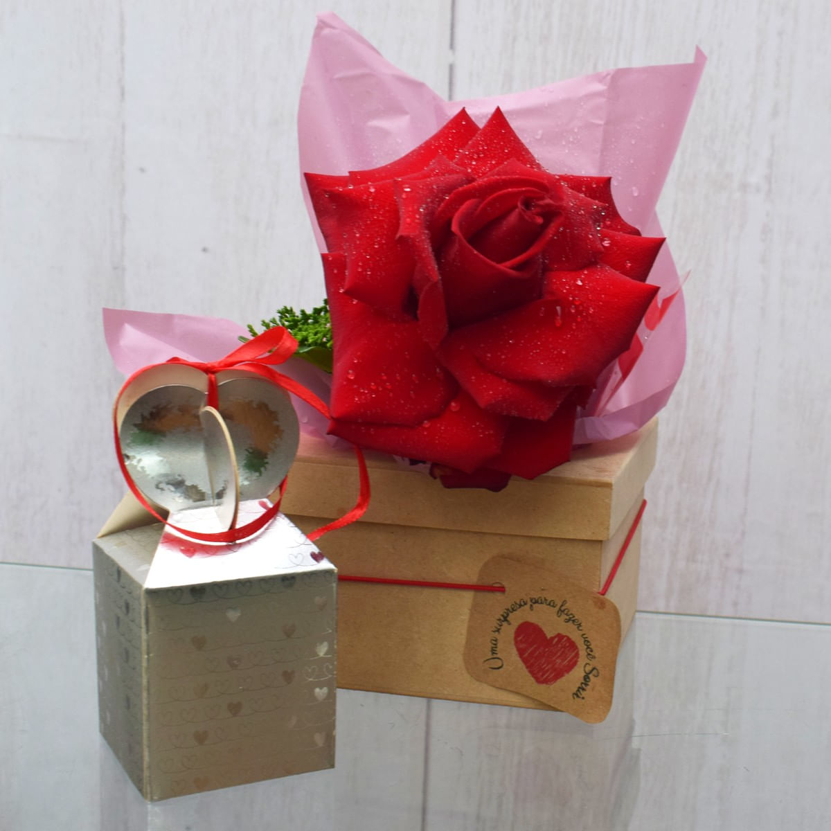 descrição: - 01 Rosa Colombiana - 01 Cx em Mdf Medindo 8 Cm X Larg e Prof 14 Cm - Celofane Decorativo em Tons de Vinho e Rosado - 01 Tag com Mensagem "uma Surpresa Para Fazer Você Sorrir"