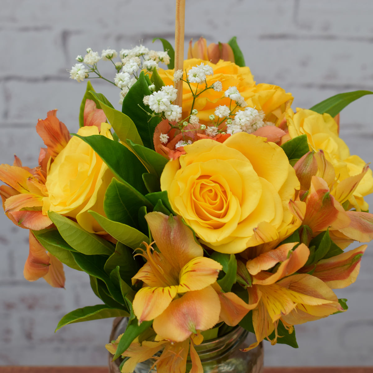 base:Cx Platter Kraft 14x14 -------------------------------------------- flores - Arranjo de Flores (descrição): - 05 Rosas Nacionais Amarelas - 03 Alstroemerias em Tons Pasteis ou 03 Astes de Flores Permanentes - 04 Galhos de Folhas de Gardênia - 01 Vaso de Vidro Reciclado Decorado com Tela Arabesco e Laço Acetinado