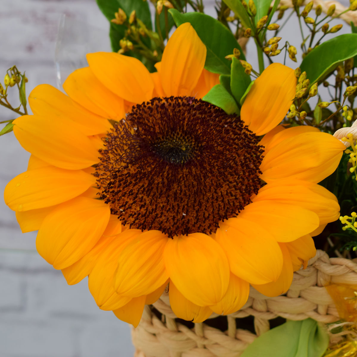 descrição do Arranjo: - 01 Mini Bolsa de Palha da Costa com Detalhes em Vual Verde - 02 Galhos de Folhas de Gardenia - 01 Girassol de Corte - 01 Galho de Flor Seca - 01 Galho de Flor Permanente em Tom de Amarelo - 01 Trufa (sabores Variados) Bombonatti - 01 Barra de Chocolate Alpino