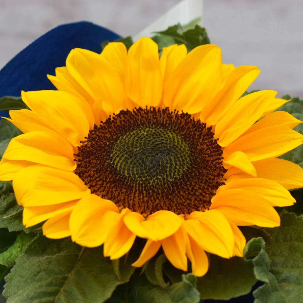 descrição: - Girassol Ornamentado Na Terra ou No Floral - Celofane Azul com Celofane Colorido e Laço Acetinado Azul Marinho - 01 Balão Bubble 10' Pol C/ Adesivo Plotter Pai Coração