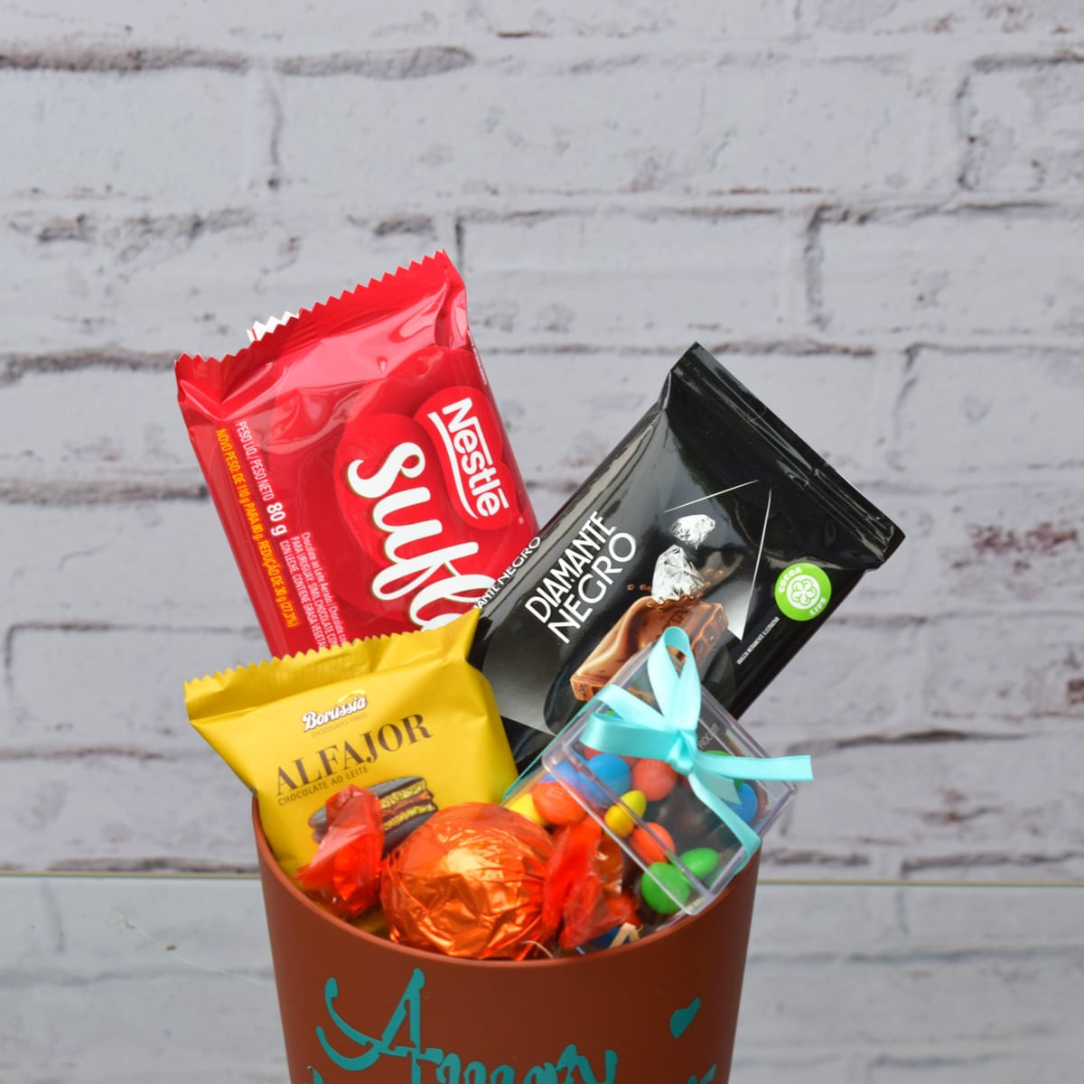 qtd produtos marca peso 1 alfajor de Chocolate borussia 50g 1 barra de Chocolate Diamante Negro lacta 90g 1 barra de Chocolate Sufalir nestlé 80g 1 potinho de Acrilico com Confeito de Chocolate m&ms 55g 1 trufa borussia 34g decoração laço Cetim de 22 Cm/acrlico/aljofre/palha