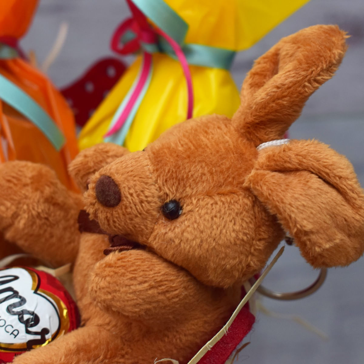 qtd produtos marca peso 3 bombom Amor Carioca neugebauer 22g 2 kit Kat nestlé 41,5g 3 mini Ovos de Chocolate Ao Leite borussia 40g decoração laço Cetim de 22 Cm/acrlico/aljofre/palha