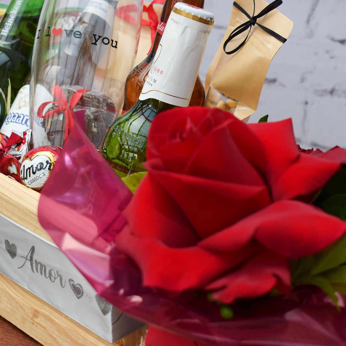 Caixote de Cervejas Para Meu Amor C/ Arranjo Pequena Mulher e Copo I Love You