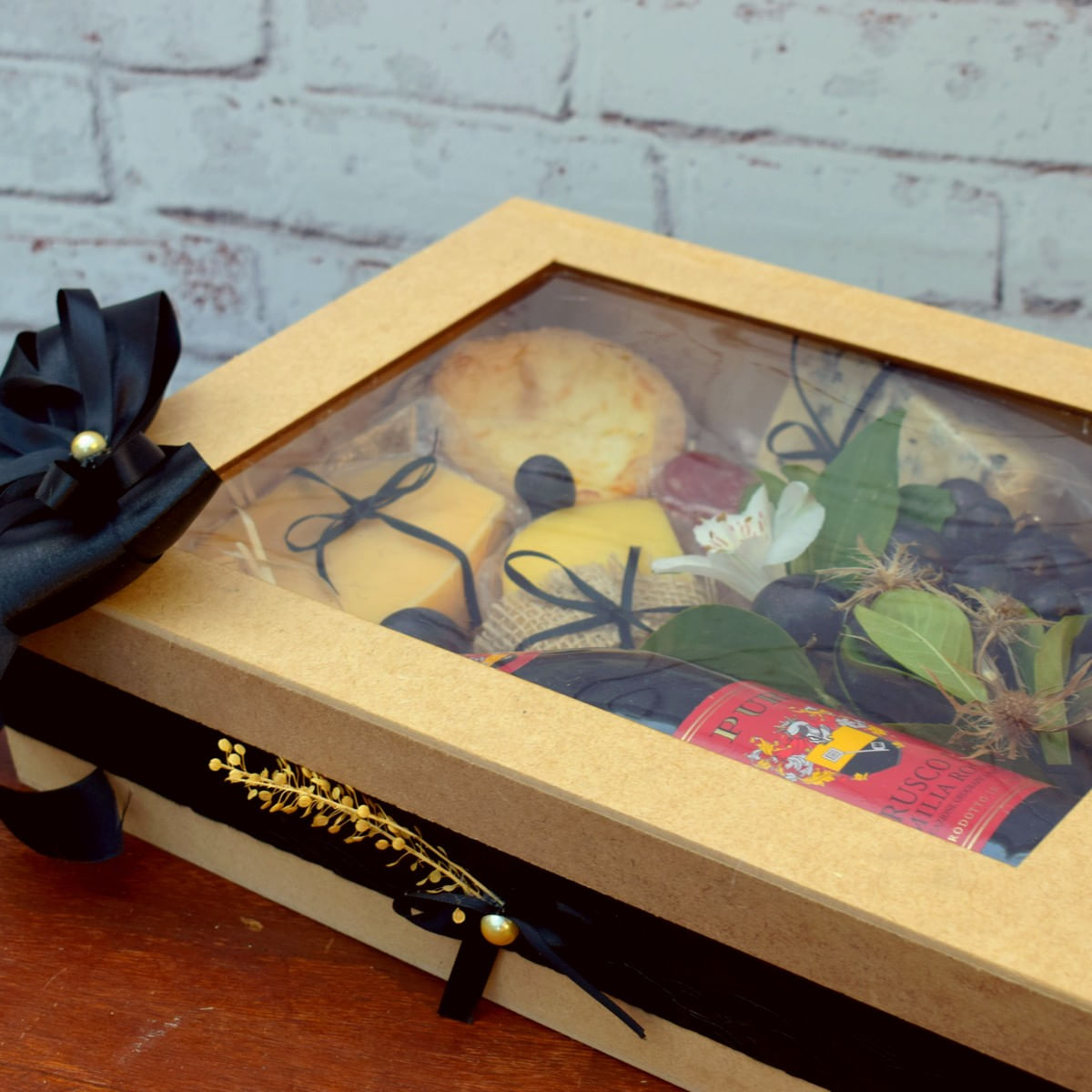 qtd produtos Não Refrigerados marca peso 1 mix de Oleaginosas No Vidro G amendoas do Ceará 150g 1 quiche denise Salgados und 1 cacho de Uva fruta 200g 1 queijo Gorgonzola são Vicente 150g 1 queijo Gouda tirolez 150g 2 queijo Provolone três Maria 200g 1 salame aurora 50g 1 vinho escolher Opção decoração laço Cetim de 22 Cm/acrlico/aljofre/celofane/palha/flores Secas