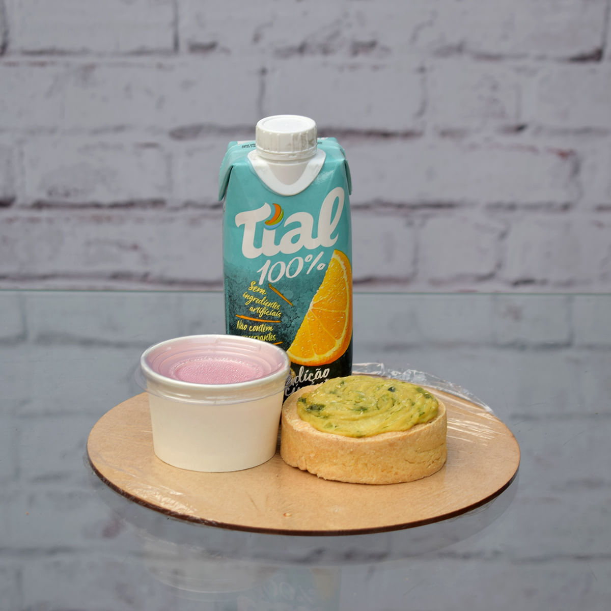 qtd produtos marca peso 1 quiche due Fratelli / Denise und 1 mousse de Fruta buon Giorno 80g 1 suco tial 330ml decoração laço Cetim de 22 Cm/acrlico/aljofre/celofane
