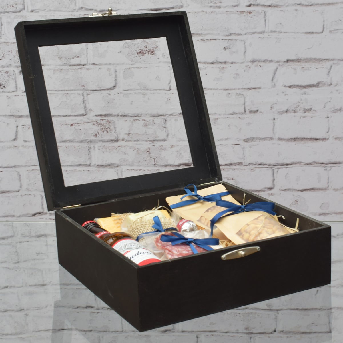 qtd produtos marca peso 1 geleia queensberry 28g 1 milho Mostarda e Mel No Saco P amendoas do Ceará 50g 1 mix de Oleaginosas No Saco P amendoas do Ceará 80g 2 trufas d Viez und 1 cerveja budweiser 330ml 1 queijo Gorgonzola Embalado a Vacuo yema/são Vicente 150g 1 queijo Gouda Embalado a Vacuo tirolez 120g 1 salame Embalado a Vacuo aurora 50g decoração laço Cetim de 22 Cm/acrlico/aljofre/palha/laço em Volta