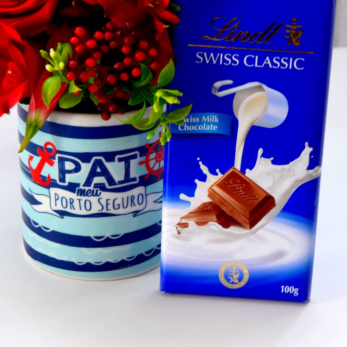 presentes: - 01 Caneca Pai-Porto Seguro - 01 Barra de Chocolate Lindt Milk 100g