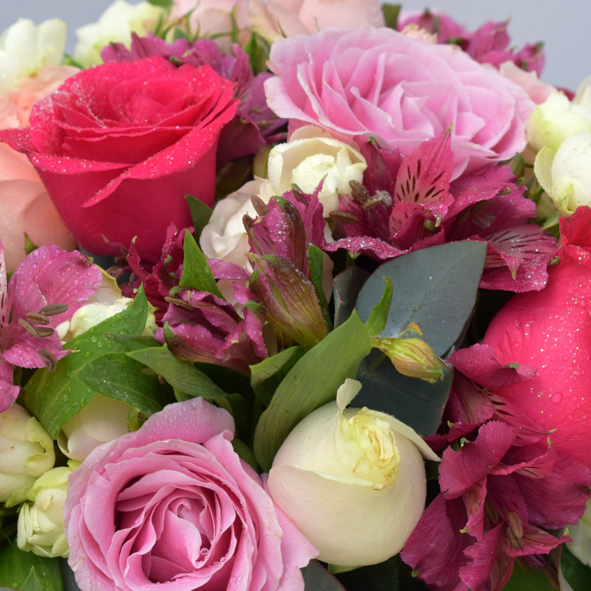 descrição: - 8 Rosas em Tons Rosados - 8 Astes de Alstroemerias - 8 Flores Sortidas da Época em Tons Rosados ( Lizianthus ou Similar) - 6 Galhos de Folhas de Gardenia - 01 Vaso de Vidro Decorado